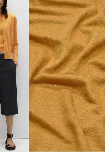 Тонкий вязаный льняной трикотаж оранжевого цвета. Материал просвечивает, мягко драпируется, приятный к телу - лучше всего подойдет для тонких кардиганов, топов, бадлонов.