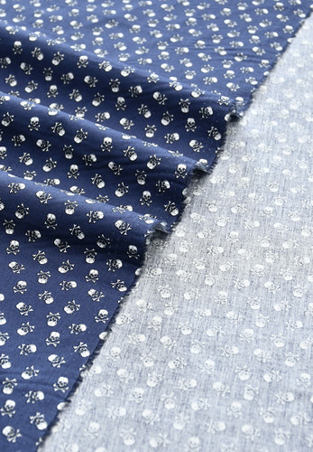 Рубашечный хлопок полотняного плетения синего цвета с черепами. Тактильно гладкий, жестковатый, тонкий. Просвечивает силуэт. Не тянется. Хорошо держит форму. Сминается. Шьем рубашки, платья, юбки и не только. Учитывайте возможную усадку.