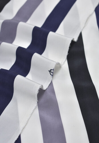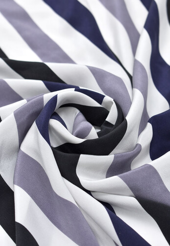 Шелковая ткань легкая, воздушная, обладает пластичностью, подойдет для моделей с кроем по косой, с драпировками. Практически не «светит» (незначительно на просвет). Со сглаженной креповой фактурой и завораживающим шелковистым лоском. Не тянется. Размер полосок 2,7см. Рекомендуем для платьев, сарафанов, туник, блуз, рубашек, юбок. Такие эффектные образы выделят из толпы и не оставят без внимания. Но их не стоит перегружать, поэтому аксессуары и вещи в пару лучше подобрать однотонные, например, в одном из оттенков узора.
