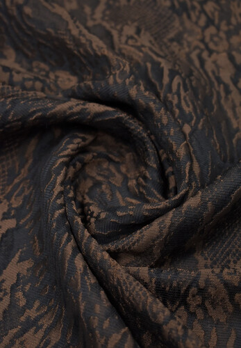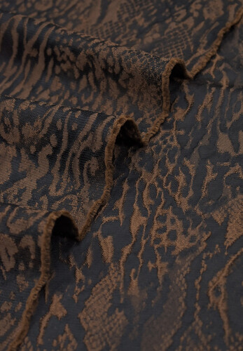 Итальянский жаккард средней плотности, упругий и шелковистый в чёрном и коричневых цветах, с пятнистым контрастным рисунком под рептилию. Полотно хорошо держит форму, в меру пластичное. Подходит для пошива платьев, жакетов, юбок, летних пальто прямых, приталенных и объёмных силуэтов.
