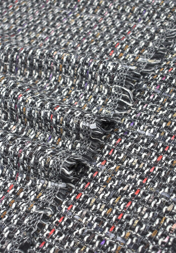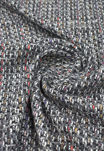Костюмная ткань в стиле Chanel черно-белого цвета с разноцветной пряжей. Полотно мягкое и пластичное, средней плотности , немного держит форму. Подходит для пошива кардиганов, жакетов, юбок, желательно на подкладке, прямых и объёмных силуэтов.