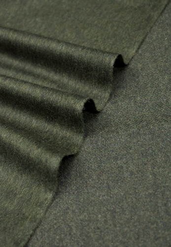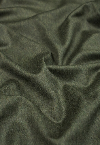 Костюмная шерсть с кашемиром в оливковом оттенке. Ткань не плотная, мягкая, на ощупь приятная с кашемировой поверхностью, не колется, не тянется. Драпируется в мелкие складочки, форму не держит. Материал пластичный, приятный тактильно. Сминаемость практически не наблюдается. На изгибах имеет небольшой лоск, поверхность гладкая. Подойдет для пошива платьев, жакетов, юбок, брюк и т.д.
