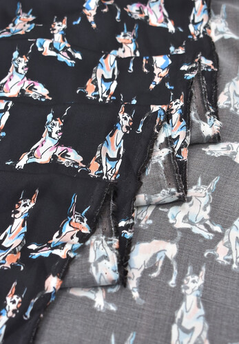 Плательно-блузочный штапель с доберманами принт. Струящийся, приятный к телу, слегка светит. Идеален для летних платьев, блузок, костюмов в пижамном стиле.