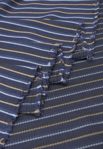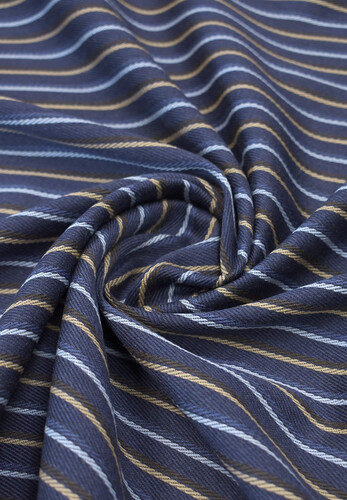Итальянский дизайнерский костюмный шелк. Материал синего оттенка в полоску. Не прозрачный. Пластичный, не тянется. Не мнется. Обладает шелковым блеском. Прекрасно подойдет на платье, жакет, юбку, брюки. Уход за материалом деликатный.