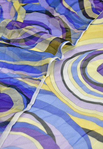 Легкий шелковый шифон, абстракция в сочетании голубого, желтого и фиолетового. Ткань очень тонкая и легкая, просвечивает, хорошо драпируется, образуя красивые волны, тактильно приятная. Ткань шелковистая на ощупь, при сминании не оставляет заломов, красиво ниспадает. Прекрасный вариант для пошива платьев, блуз, юбок, накидок и многого другого.
