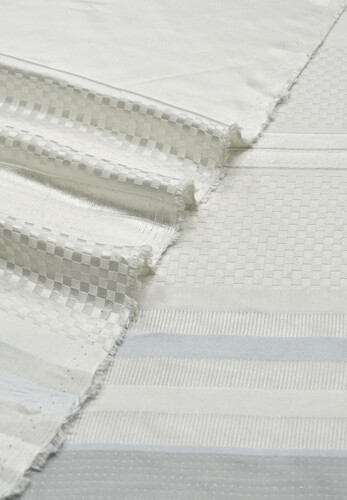 Тактильно очень мягкий и приятный, тонкий и летящий, струящийся шелковый тонкий атлас с некрупной жаккардовой выработкой в мелкую клеточку по полотну от FENDI. Сам материал молочного оттенка. Не прозрачный, но прослеживается силуэт на просвет. Пластичный, не тянется. Немного мнется. Обладает шелковым блеском. Прекрасно подойдет на платье, блузку, тунику, юбку и одежду в бельевом стиле. Уход за материалом деликатный.