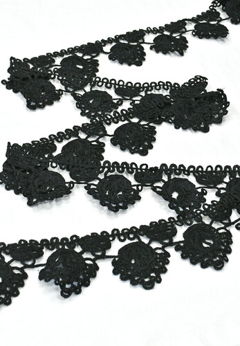 Кружевная тесьма черного цвета, ажурная, плетеная. Очень мягкая и пластичная, хорошо складывается в складки. Рекомендуется для украшения пальто, жакетов и теплых платьев. Попробуйте обработать горловину и проймы в изделиях из шерстяных ворсовых тканей, букле, Шанель. Улисс. Ширина: 9 см.