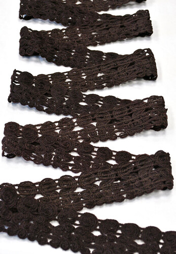 Кружевная тесьма шоколадного цвета, ажурная, плетеная. Очень мягкая и пластичная, хорошо складывается в складки. Рекомендуется для украшения пальто, жакетов и теплых платьев. Попробуйте обработать горловину и проймы в изделиях из шерстяных ворсовых тканей, букле, Шанель. Ширина тесьмы 5 см. Цена указана за 1 м