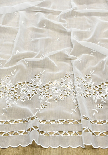 Шифон с вышивкой молочно-белого цвета. Ткань тонкая, полупрозрачная, обе кромки обработаны. Смотрится очень нежно и женственно. Прекрасно подойдет для пошива платьев, юбок, летних сарафанов, блузок и туник.
