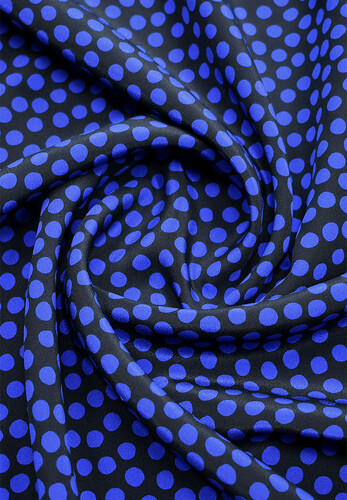 Ткань из натурального шелка принт в мелкий горох. Цвет ткани - синий в сочетании с черным. Ткань приятная на ощупь, мягкая, непрозрачная, поверхность шелковистая, скользящая, с отливом, не просвечивает. Для пошива платья, платье-рубашка, костюм пижамного стиля
