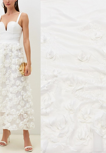 Оригинальная ткань для свадебного платья - шифон с вышивкой. Вышивка выполнена гладкими атласными нитями, кроме этого ткань уникальна за счет объемного густого цветочного узора, который идет по всему полотну. Лепестки цветов тонкие, легкие, при любом движении они подвижны как живые. Ткань воздушная, нежная, необыкновенно красивая. К сожалению фото не передает всей красоты этого уникального дизайна. Для пошива не только свадебных платьев, но и вечерних. Также подойдет для блузки, топа, туники, юбки. Blumarine