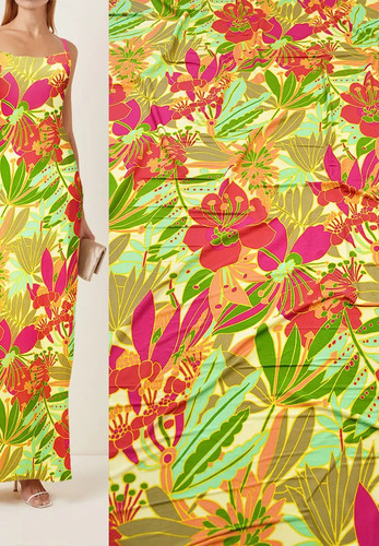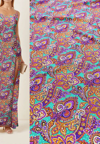 Шелк фиолетовый восточный узор. Ткань невероятно легкая и приятная на ощупь, гладкая, с красивым умеренным лоском, который придают мелкие горошины расположенные по всему рисунку. Текстура нежная, мягкая, прекрасно драпируется, что позволяет использовать его для создания одежды практически любых форм. Оригинально смотрятся костюмы пижамного силуэта, платья халатного типа, свободные брюки, комбинезоны, вечерние наряды.