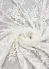 Молочно-белое кружево украшенное флористическим узором, вышитым бисером и стеклярусом. Полотно средней жесткости, пластичное, блестящее, красивое и нарядное. Элементы рисунка окантованы сутажем, что придает роскошный рельеф на поверхности. Обе кромки обрамлены фестонами с ресничками. Изделие может быть как полностью из этой ткани, так и с отдельно декорированными фрагментами, например, рукава, лиф, подол, спинка. Сегодня из кружева шьют не только вечерние и свадебные платья, но и юбки и шорты. Основой может выступать плотный шелк, трикотаж, замша. Такие образы являются прекрасным вариантом для прогулки летний день, для свидания или вечеринки.