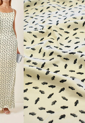 Шармез бежевого оттенка с черными машинками. Легкий, пластичный, гладкий и шелковистый на ощупь. Имеет красивый атласный лоск. Шелк в составе полотна придает ему невероятную мягкость и нежность, ткань струящаяся и приятная. Подойдет для блузок, туник, платьев, юбок, брюк в пижамном стиле. Хорошо будут смотреться платья-рубашки, а также стильные домашние халаты и костюмы.