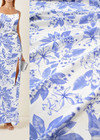 Хлопок белый с синими цветами. Тонкий и легкий, слегка подкрахмаленный, благодаря чему обладает хорошей плотностью и немного держит форму. На ощупь ткань приятная, гладкая. На поверхности мелкий геометрический узор, который красиво смотрится в изделии. Крупные цветы смотрятся женственно и нарядно. Такой дизайн подойдет для летних платьев в романтическом стиле, юбок, туник. Можно использовать для платья или сарафана на выпускной бал.